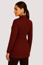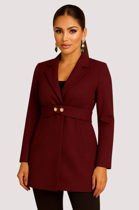 Elevate your wardrobe with this elegant longline blazer designed for a chic and polished look. Featuring a classic notch lapel collar, long sleeves, and a tailored silhouette, this blazer is perfect for both formal and semi-formal occasions. The design includes a sleek waist belt detail with dual gold-tone buttons, enhancing the structured fit and adding a touch of sophistication. Crafted from premium-quality Tweed fabric, it ensures comfort and durability while keeping you stylish throughout the day. The functional side pockets add practicality, making it a versatile piece for office wear, meetings, or evening outings. Pair it effortlessly with trousers, skirts, or dresses for a refined ensemble.
