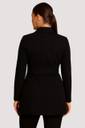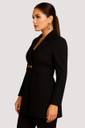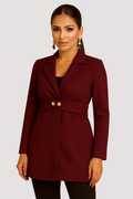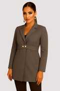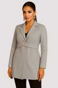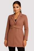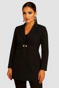 Elevate your wardrobe with this elegant longline blazer designed for a chic and polished look. Featuring a classic notch lapel collar, long sleeves, and a tailored silhouette, this blazer is perfect for both formal and semi-formal occasions. The design includes a sleek waist belt detail with dual gold-tone buttons, enhancing the structured fit and adding a touch of sophistication.