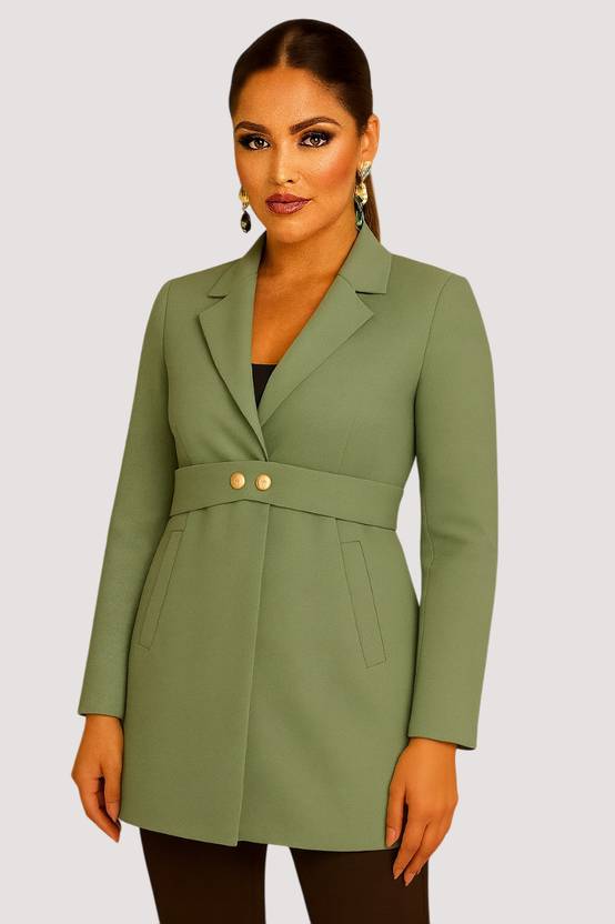 Elevate your wardrobe with this elegant longline blazer designed for a chic and polished look. Featuring a classic notch lapel collar, long sleeves, and a tailored silhouette, this blazer is perfect for both formal and semi-formal occasions. The design includes a sleek waist belt detail with dual gold-tone buttons, enhancing the structured fit and adding a touch of sophistication.