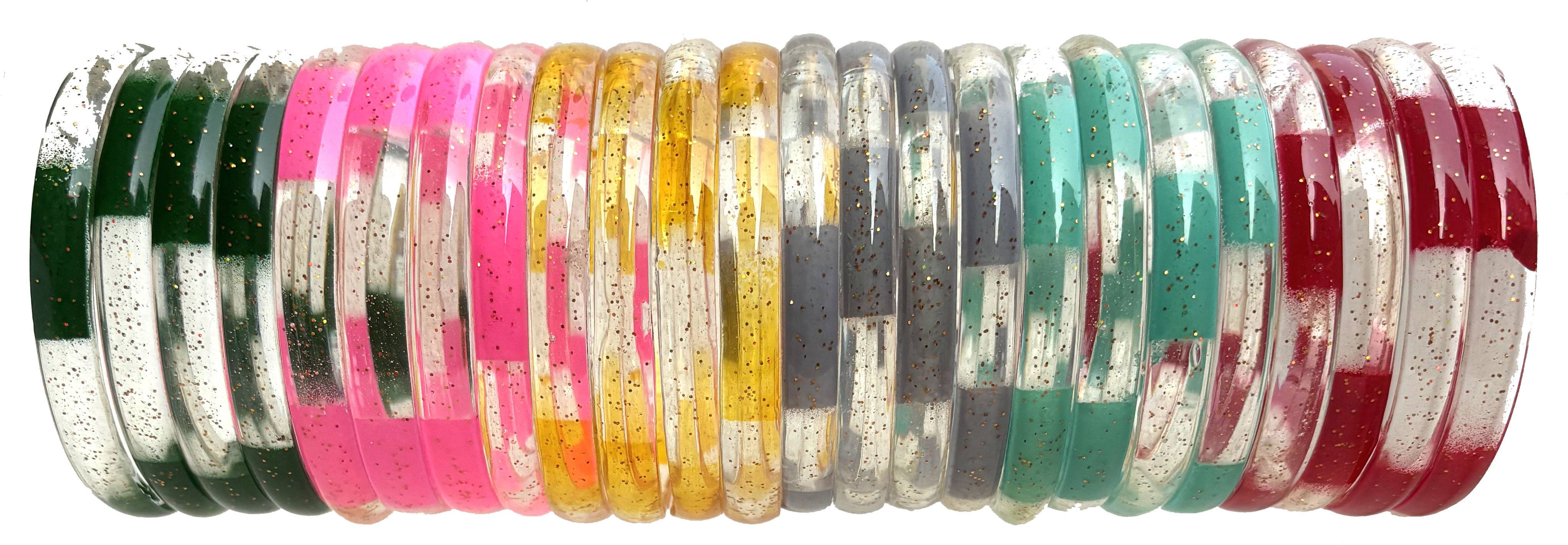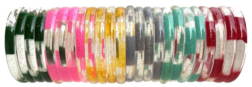Glossy Plain Glitter Design Transparent Glass Bangles. Comes With 6 Different Colour. The design of this Kada set can make your look beautiful and attractive, As the material of this Kada set is made by very good quality material (like: Glass) and experienced labor as we cannot compromise our clients with the quality of our products Transparent Plastic Box Packaging, Pack Of 6 Colours / 12 Bangles.