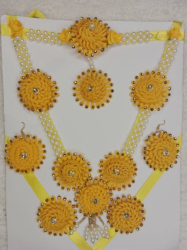 Artifical flowers are traditional indian Flowers that are popularly used in adornment of traditional wears. They are also used in making light weight jewellery and fashion accessories. This Beautiful Jewellery is made of Fabric laces and flowers.These fabric are extremely light weight and jewellery comes out extreme light weight. They are Hand made jewellery and designed by our designers team.This jewellery gives you a fabulous look and being light weight provide extra comfort. We guaranty that you are going to love this jewellery set. This jewellery is best suitable for wedding,engagement,haldi,mehandi,baby shower,mehndi and religious functions and ceremony. Floral design to match your beauty and clothes which gives you an equisite and fashion look, Suitable for all occassions. Light weight jewellery and easy to carry for hours. Can be used multiple times. Perfect to compliment your traditional look. This jewellery can be worn on all occasions. Flower jewellery set for haldi / sangeet / mehendi functions, Gives you a royal and fashionable look