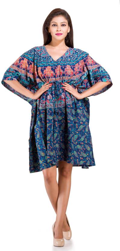 Animal Print Cotton Elephant Blue Mandala Caftan Short Party Dress Plus Size Women 4X Women Kaftan