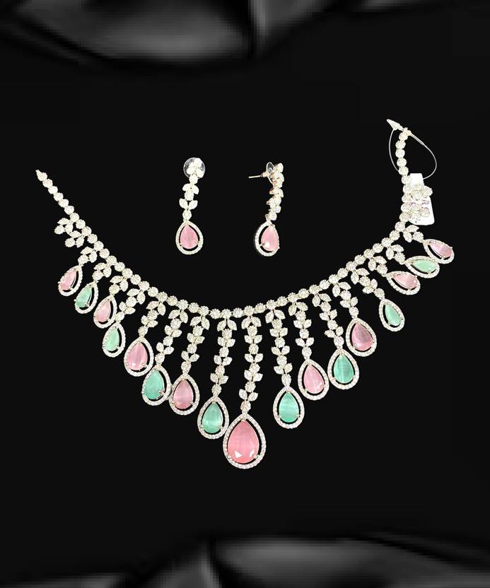 A jewellery set typically consists of matching pieces of jewellery that are designed to be worn together. It often includes a necklace, earrings, a bracelet, and sometimes a ring. The specific design and materials used can vary greatly, ranging from simple and understated to elaborate and ornate. Jewellery sets can be made from various materials such as precious metals like gold or silver, and adorned with gemstones, diamonds, pearls, or other decorative elements. The style and theme of a jewellery set can be tailored to suit different occasions, such as formal events, weddings, or everyday wear. Ultimately, the description of a jewellery set will depend on its individual design and characteristics.Haniya Collection original American diamonds are also known as cubic zirconia or faux bijoux. Cubic zirconia is a man-made, lab-created gemstone that resembles a diamond. It is made of zirconium dioxide and is optically flawless. This means that it looks very similar to a natural diamond, but it is much more affordable.