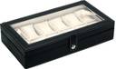 Specifications: Material: Faux Leather, Medium Density Fiberboard (MDF) and Suede interior pillows, Window: Glass, Color: Black, Product Dimensions: 38 cms(L )x 20.5 cms(W )x 7.8 cms(h) Watch Slot Size: 5.5cms(w) x 10 cms(L) x 5cms(h), Pillow Size: 10 cms x 6.5cms