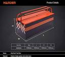 * 3 Tier Design, storage capacity is greater, easy to manage and carry the tools. The partitions are linked by rivets, durable and difficult to damage. * Harden Professional 5 Draw Metal Hip Roof Tools Box is made Cold Rolled Steel and With electro-powder coating to resist scratch & solvent markings and also With heavy duty metal latches. * Harden Professional 5 Draw Metal Hip Roof Tools Box is made Cold Rolled Steel and With electro-powder coating to resist scratch & solvent markings and also With heavy duty metal latches. * The surface printed with the brand logo words, highlight the charm of the brand and style. * Length: 530 mm X Width: 200 mm X Height: 200 mm - Weight: 4.60 KG