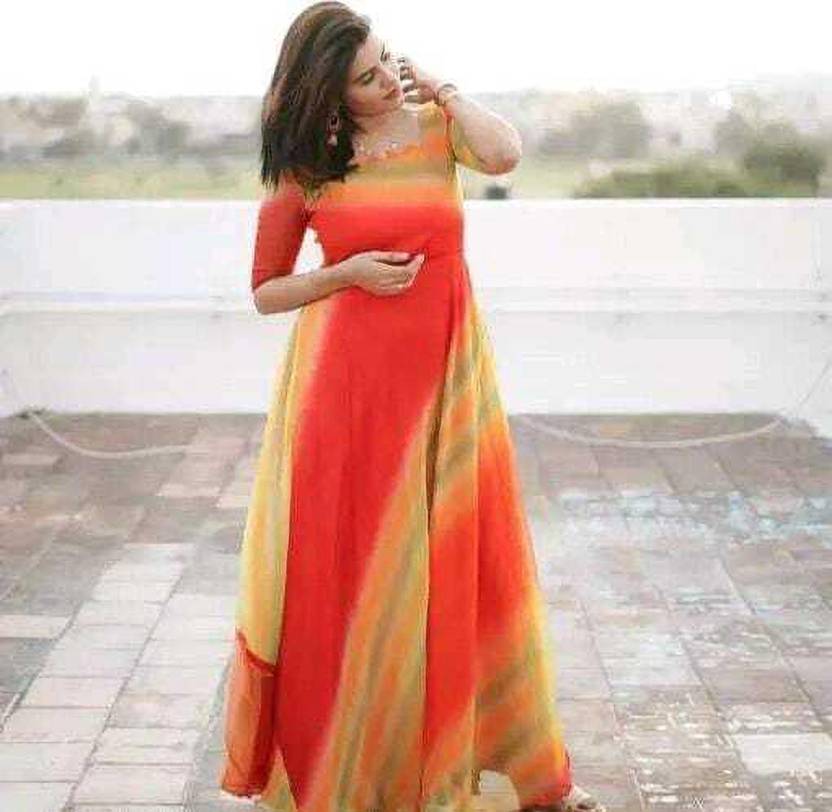 Women Leheriya Georgette Gown Kurta (Orange, Yellow, Green)