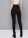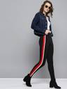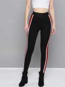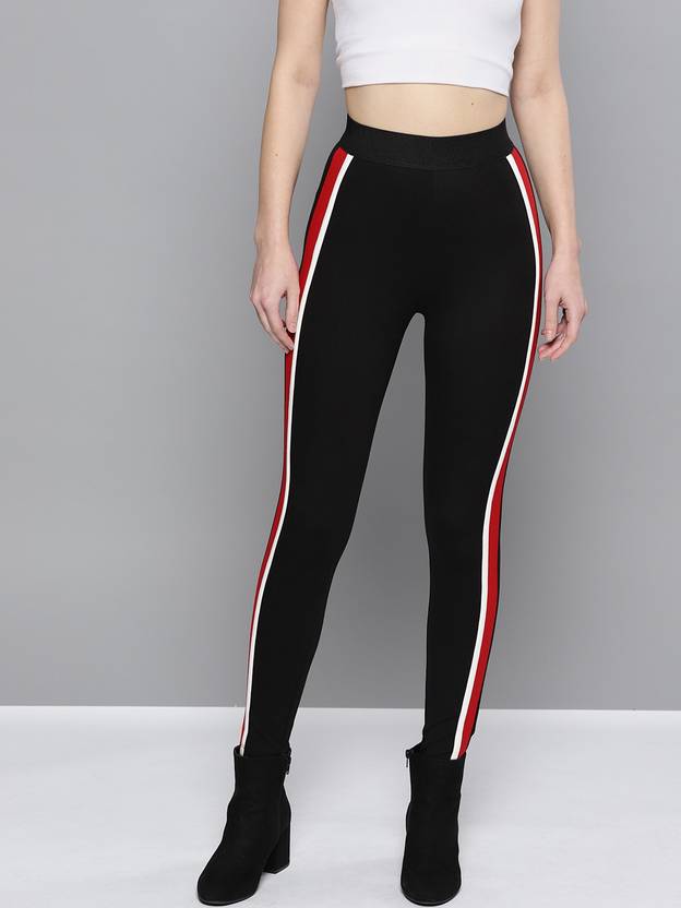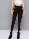 A pair of black and red solid treggings with side stripes, has an elasticated waistband with slip-on closure
