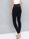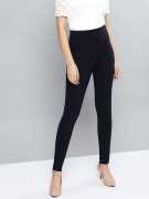 A pair of navy blue solid treggings, has an elsticated waistband
