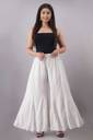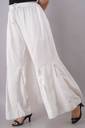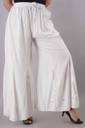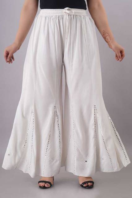 A white flared palazzo pants from our latest collection. It is a gorgeous accentuated with artificial mirror work and embroidery all over, elasticated waist and drawstring. Crafted in finest rayon, this will prove a great addition to your summer wardrobe.