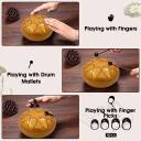 PRINCIPLE OF DRUM SOUND: Tongue drum is a percussion instrument that is driven by the sound of the tongue to resonate the entire cavity. With drumsticks, the tongue is vibrated. After mastering the basic rhythm, you can strike a beautiful rhythm. There is no complicated music theory system, simple and easy to learn.FIND YOUR INNER PEACE WITH MUSIC: This steel tongue drum can produce a clean, ethereal echo. Delightful sound can peace people's mind, feel the inner peace, so as to get a deep relaxation mind and body.DESIGN & CRAFT: The steel drum is hand-made by craftsmen, and the steel tongue drum is made of titanium alloy steel, The drum body is full and round, and the drum surface sound tongue is shaped by lotus petals. It combines modern innovative design, craftsmanship, sound theory, simple shape and easy to carry.APPLICATION SCOPE: Steel drum can be adapted to many occasions, can be used for concert accompaniment, yoga meditation, music enlightenment education, spiritual rehabilitation, the drum has beautiful sound, mellow, moderate volume, classical and soothing melody can relieve stress and make you tense To calm down slowly. Steel drum set accessories: 1 * Steel Tongue Drum 1 * Drum Bag 2 * Drum Mallets 1 * Music Score 1 * Spare Notes 4 * Finger Picks.PERFECT SOUND QUALITY: The 6-inch steel drum has a standard C key with 8 notes. The sound is crisp and beautiful, allowing novices and professional players to easily play more different types of songs. The tone of the steel tongue drum is soft and melodious, and the tone is very stable. With the ethereal, pure and mellow drum sound, you can feel the relaxation and joy from the heart.