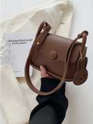 The bag's front is adorned with a subtle circular button closure, which not only enhances the bag's aesthetic appeal but also provides easy access to the contents inside. The stitching along the edges is precise and clean, highlighting the craftsmanship of the design. The handbag comes with a slender adjustable strap, allowing it to be worn as a crossbody or over the shoulder, offering both style and convenience.