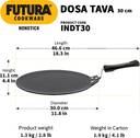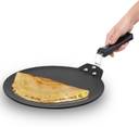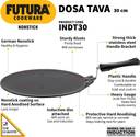 The Dosa Tava is designed with just the right curvature and thickness to give you the best cooking results when making dosa (rice and gram pancakes). The flange, which firmly attaches the handle with strong stainless steel rivets, is uniquely designed to not interfere with the cooking surface and to hence maximise the cooking area, allowing you to make a very large dosa, or several uttapam or cutlets at one time. The 4.88 mm extra thick heavy gauge metal ensures fast and even heat conduction and retains heat well. The cooking surface is made of PFOA-free with a unique patented process by which high quality nonstick coating (made in Germany) is locked firmly into the tough Hard Anodized surface underneath. Therefore, the nonstick, if used properly, would last longer than the ordinary nonstick. The Dosa Tava Instruction Manual has 11 tested recipes for the Dosa Tava, including four varieties of dosa, uttapam, cutlets and rolls. The Dosa Tava is suitable for domestic gas, induction and radiant electric cooktops.