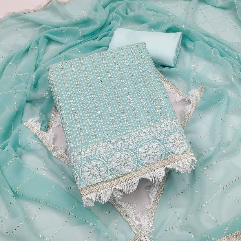 *Exclusive Dress Material Suit For Women SURAJMUKHI ▪ TOP FABRICS:- FOX JORJAT {Cut:- 2:10 Mtrs.} ▪ INNER + BOTTOM FABRICS: MICRO CRAPE {Cut:- 3:50 Mtrs.SALANG} ▪ DUPATTA FABRICS: JORJAT FOX JAAL SECVANCE WORK {Cut:- 2:20 Mtrs.} ▪ WORK TYPE: EMBROIDERY & SECVANCE WORK ▪ SIZE : Free Size upto 42" (Semi Stitched) ✔Best Quality ✔Ready Stock
