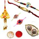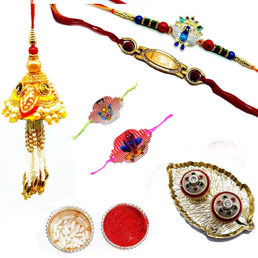 Bhaiya Bhabhi THALIA80 Assorted Rakhi, Lumba, Chawal Roli Pack Set (Rakhi, Lumba, Thali)