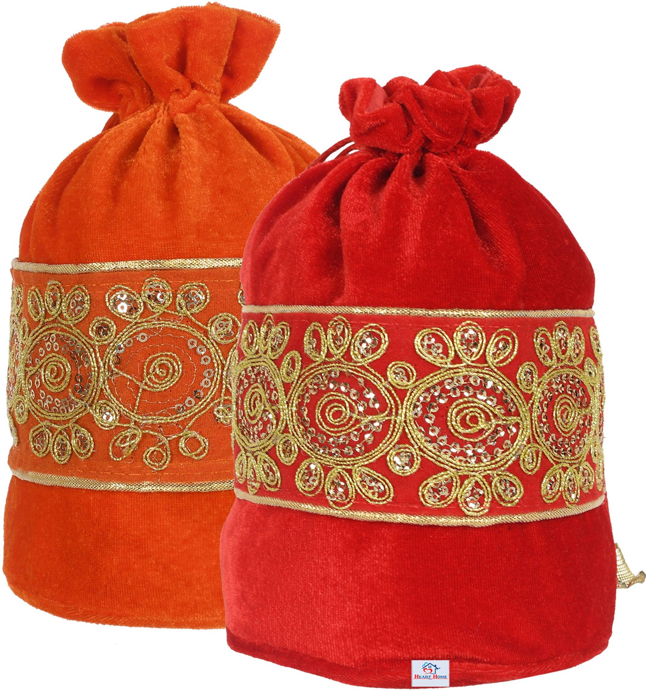Package Contents: 2 Piece Velvet Potli Bag,Material: Velvet, Color: Orange & Red,Product Dimensions: 20cm x 24cm,Women's Potli Handbags are an essential item in the life of a modern woman. They are used today not just for carrying daily items but are also style statements. A form of self-expression and signal of personal style, handbags are also an entrée to luxury and glamour. This handbag is both fashionable and utilitarian - it's design goes beyond just style.,These Exquisite Pretty Pouches Are Great Storage For Coins,Dry Fruits, Chocolates, Shagun Items, Candles, Cosmetics, Key Rings, Potpourri, Jewellery,Also For Carrying Essentials While Travelling.,This design combines both convenience and style, to help keep you organized, fashionably! Enrich your look and style with this handbag. The luxurious look and feel of the material makes this handbag stand out in the crowd. It is best paired with your ethnic wear giving you a royal feeling.,Known for their convenience, drawstring closures also allow easy