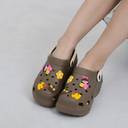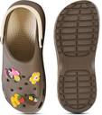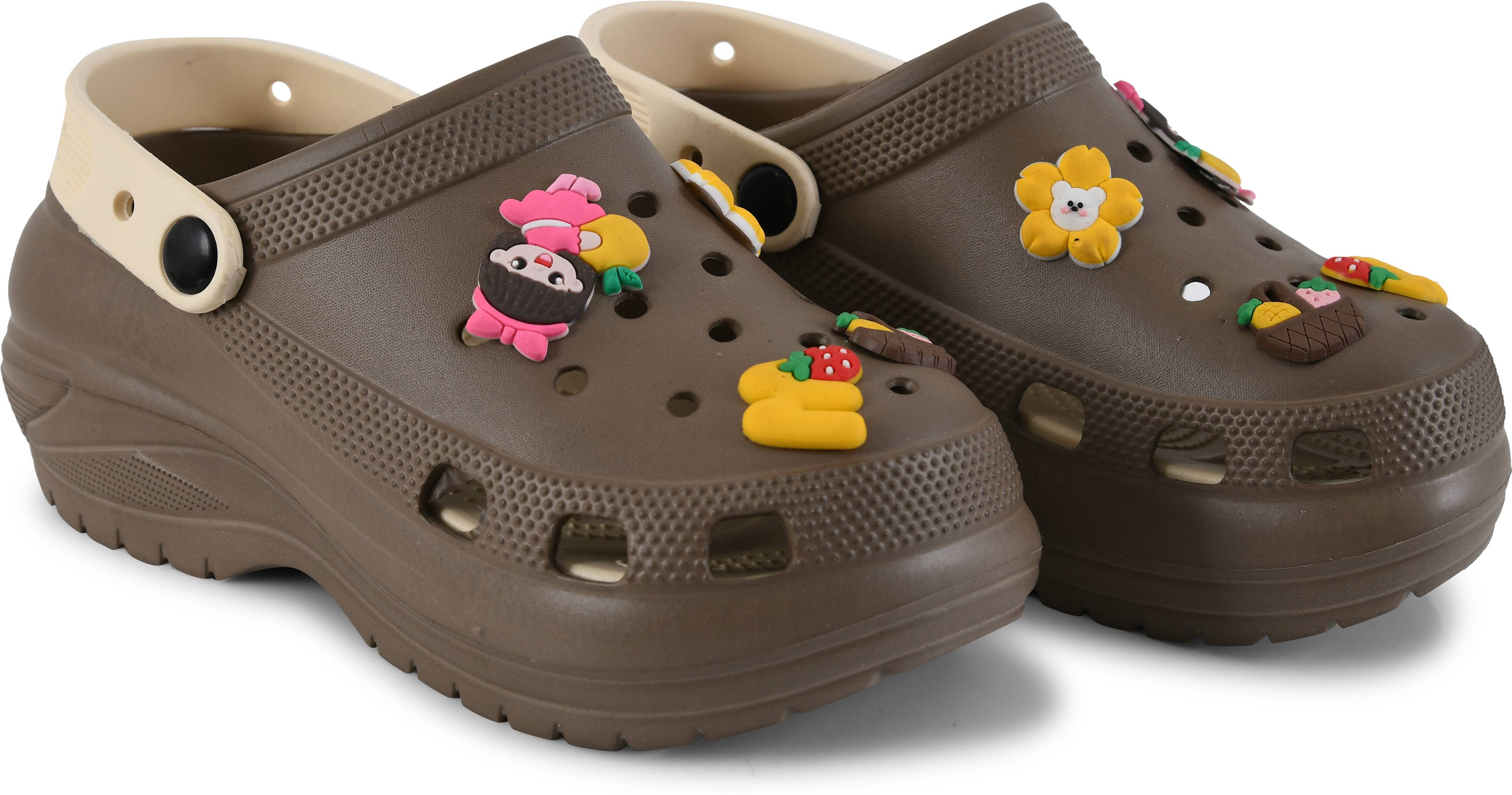 Step into comfort and style with these brown clogs featuring playful and colorful character charms. Designed with a cushioned sole and breathable perforations, these slip-on shoes are perfect for casual wear, indoor lounging, or quick errands. The whimsical decorative charms add a fun, personalized touch, making these clogs ideal for both kids and adults who love quirky fashion.