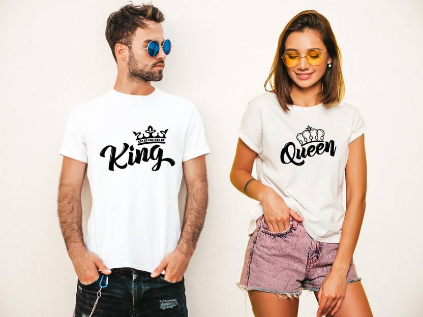 Printed Couples White T shirt Polyester T Shirt for Couple Round Neck T Shirt