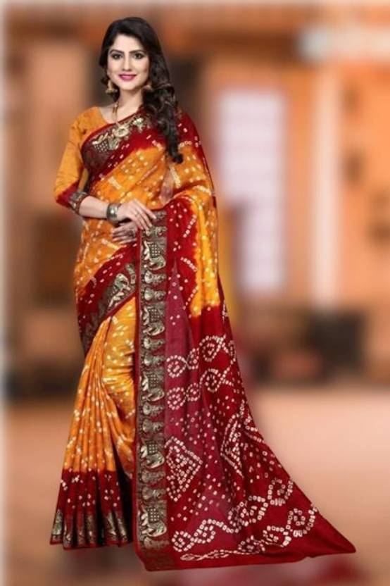 Bandhani is a type of tie-dye textile embellished by plucking the fabric with the fingernails into numerous small bindings that create a figurative pattern. This lovely Art Silk Bandhej saree is expertly designed to enhance your appearance. Wear this one with pride as you make your way to events and gatherings. It works well for both formal attire and special occasions. This Bandhani design saree gives your appearance exactly the perfect amount of charm and attractiveness. Saree is available in vibrant color bandhej prints with a cultural print border. The stunning sheen of the art silk fabric highlights the saree's beauty. During the festival season, use this exquisite bandhej saree with a traditional jewellery for a stunning look. The blouse piece for the saree is 0.8 metres long. It's simple to wash this saree at home. Please be understanding if there are slight colour differences as a result of photography using additional illumination.