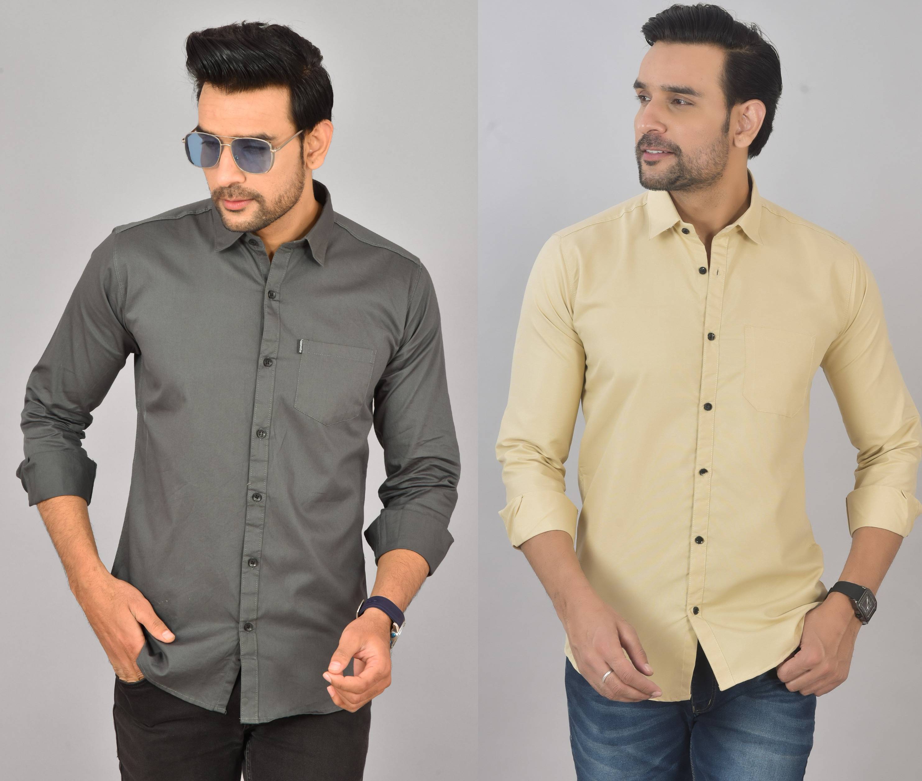 HEMS Men Solid Casual Beige, Grey Shirt (Pack of 2)
