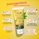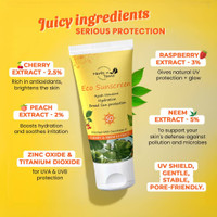 Boasting a thoughtfully selected mix of fruit and herbal extracts, this sunscreen supports the skin’s appearance and resilience. With cherry extract known for its antioxidant properties, and peach extract to help with hydration and calming, this blend can assist in soothing irritation. Raspberry extract offers a natural boost in glow, while neem extract supports the skin’s defence against pollutants and microbes. Zinc oxide and titanium dioxide are included as mineral filters for sun protection.