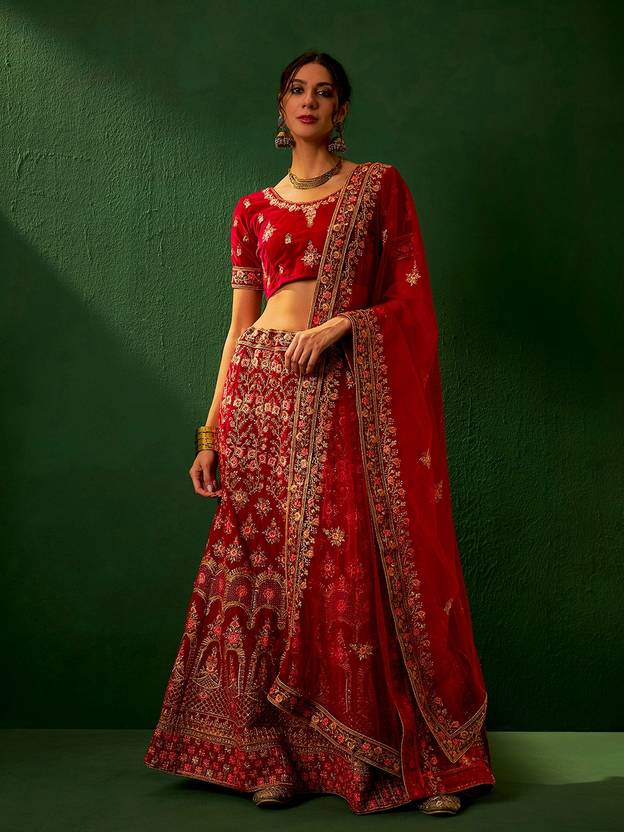 Women'S Red Semi-Stiched Heavy Zari Multi Embrodiery,Daimond With Embrodiered Blouse And Embrodiered Dupatta Velvet Lehenga Choli Having Red Color Un-Stitched Choli Of Velvet Fabric And Red Color Dupatta Of Net Material || Images Are For The Referance Purpose Only, Color Of The Actual Product May Little Vary From The Image Due To Screen Resolution