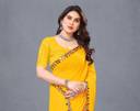 Featuring a solid pattern, this saree brings timeless elegance to any wardrobe. Its Bollywood-inspired design showcases a graceful drape that enhances its charm. Its border is adorned with intricate mirrorwork, adding a touch of sparkle with every movement. This delicate detailing along the edges complements the overall simplicity of this solid pattern, striking a balance between tradition and modern aesthetics.