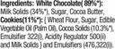 WHITE CHOCOLATE [89%], MILK SOLIDS [34%], SUGAR COCOA BUTTER, COOKIES [11%], REFINED WHEAT FLOUR [MAIDA], SUGR EDIBLE VEGETABLE OIL[PLAN OIL]