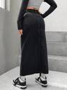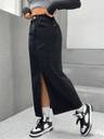 woman wearing a high-waisted, dark blue denim maxi skirt with a prominent front slit that reaches above the knee. The skirt has a classic five-pocket design and features a button and zipper closure. The denim has a slight faded wash for a vintage look. Sh