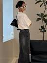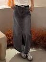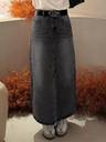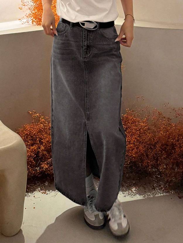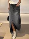 woman wearing a high-waisted, dark blue denim maxi skirt with a prominent front slit that reaches above the knee. The skirt has a classic five-pocket design and features a button and zipper closure. The denim has a slight faded wash for a vintage look. Sh