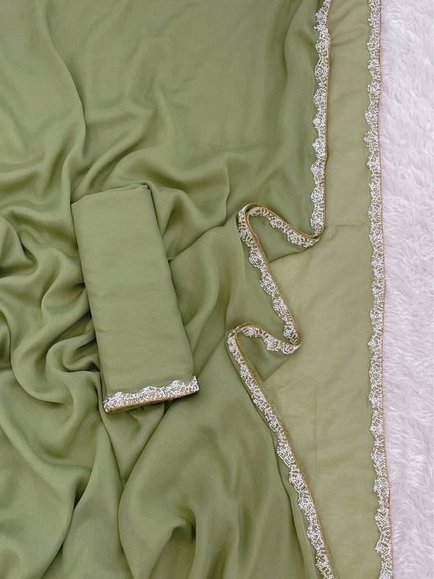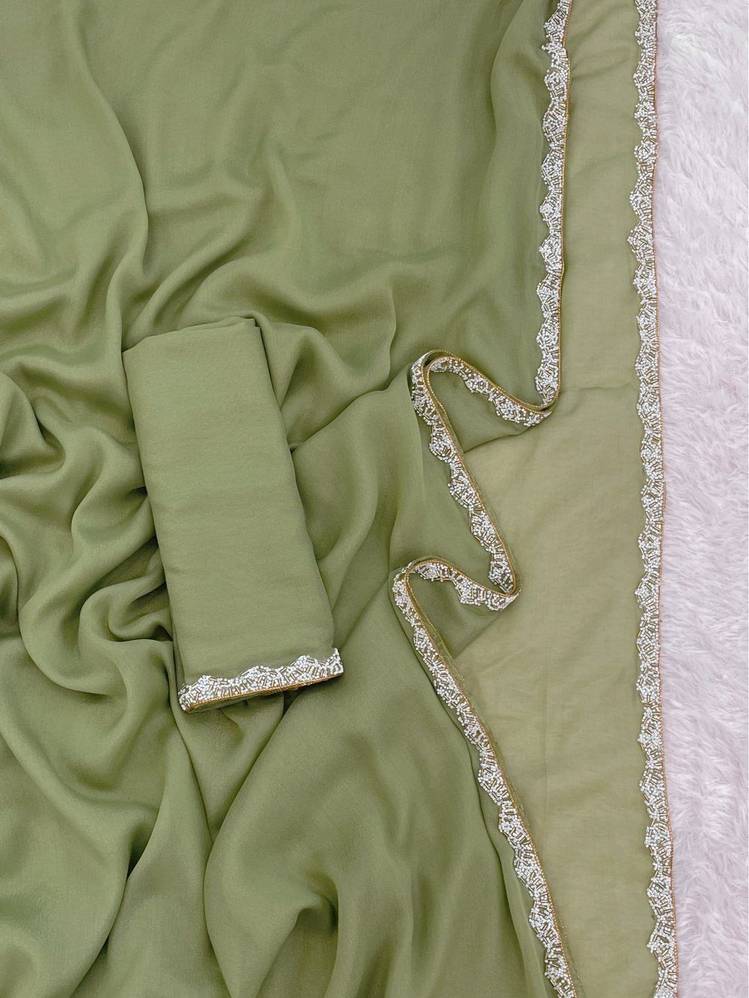 LACEMOTI-Gerogette Simmer Fabric Full Solid\ Plain With Small Moti Lace Side Border New Trending Saree