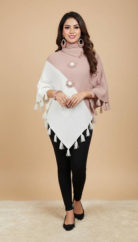 Stay cozy and stylish this winter with our premium knitted poncho. This elegant piece features a modern dual-tone colorblock design in soft dusty pink and ivory white, making it a versatile addition to your cold-weather wardrobe.