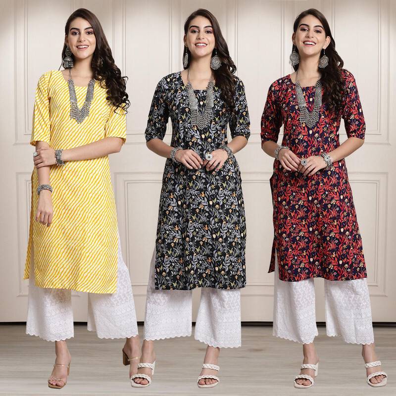 Pack of 3 Women Printed Crepe Straight Kurta (Multicolor)