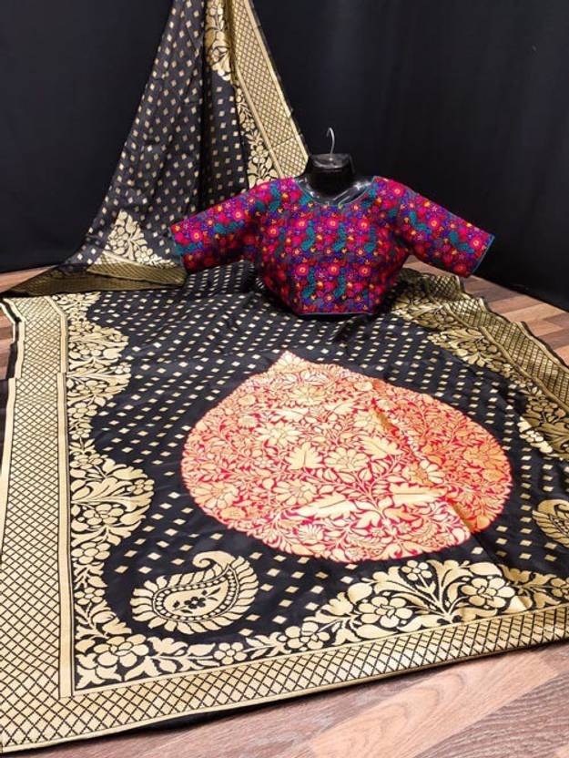 Solid/Plain Banarasi Silk Blend Saree (Black)