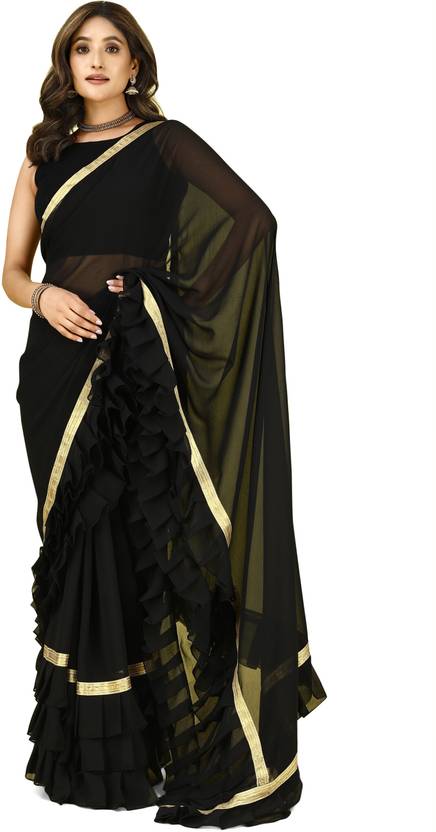 Add glamour to your wardrobe with this Bollywood-inspired Georgette Frill Saree, beautifully paired with a premium Mulberry Silk Blouse. Designed for women who love the combination of style and comfort, this saree features a ruffle/temple border, self-design, and a flowing silhouette.