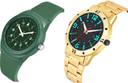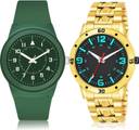 Dial Colour : Green And Black ; Band Colour : Green And Gold ; Case Shape : Round ; Band Material : Plastic And Stainless Steel ; Case Diameter : 42 And 43 mm ; GROOT Classical Present Kids And Gold Chain Green And Gold Colour Analog Plastic And Stainless Steel Belt 2 Watch Combo For Boys And Men - BM120-(46-S-21)