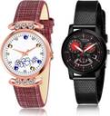 Dial Colour : White And Black ; Band Colour : Red And Black ; Case Shape : Round ; Band Material : Genuine Leather And Plastic ; Case Diameter : 29 And 32 mm ; GROOT Contemporary Tread Simple Red And Black Colour Analog Genuine Leather And Plastic Belt 2 Watch Combo For Women And Girls - GW5-(37-L-10)#