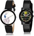 Dial Colour : White And Green ; Band Colour : Black ; Case Shape : Round ; Band Material : Genuine Leather And Plastic ; Case Diameter : 32 mm ; GROOT Brand New Professional Peacock Black Colour Analog Genuine Leather And Plastic Belt 2 Watch Combo For Women And Girls - G271-(34-L-10)#