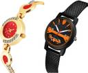 Dial Colour : Red And Black ; Band Colour : Gold And Black ; Case Shape : Round ; Band Material : Stainless Steel And Plastic ; Case Diameter : 21 And 32 mm ; GROOT Contemporary Analogue Chain Gold And Black Colour Analog Stainless Steel And Plastic Belt 2 Watch Combo For Women And Girls - G441-(33-L-10)#