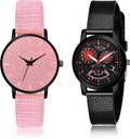 Dial Colour : Pink And Black ; Band Colour : Pink And Black ; Case Shape : Round ; Band Material : Genuine Leather And Plastic ; Case Diameter : 32 mm ; GROOT Modern Quartz Embossed Designer Dial Pink And Black Colour Analog Genuine Leather And Plastic Belt 2 Watch Combo For Women And Girls - GM328-(37-L-10)#