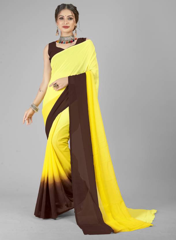 Anand Sarees Color Block, Solid/Plain Bollywood Georgette Saree (Brown, Yellow)