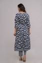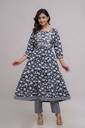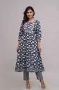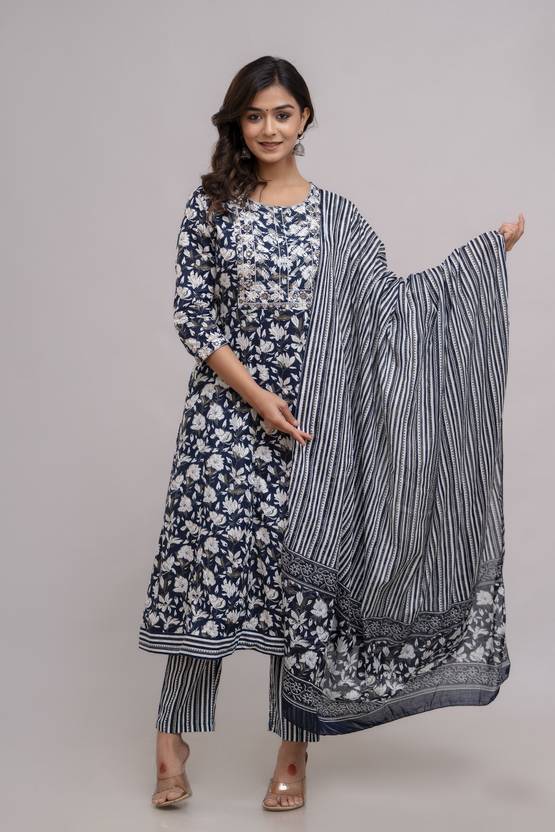 Blue floral printed cotton silk kurta, Crafted with intrinsic sequin and cut dana handwork embroidery. Styled with Round neckline. Paired with matching salwar and dupatta. Apt for semi formal wear.