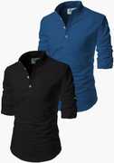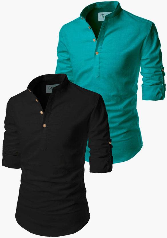 Pack of 2 Men Solid Cotton Blend Straight Kurta (Black, Blue)