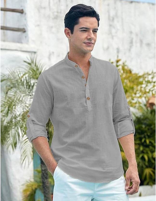 Men Solid Cotton Blend Straight Kurta (Grey)