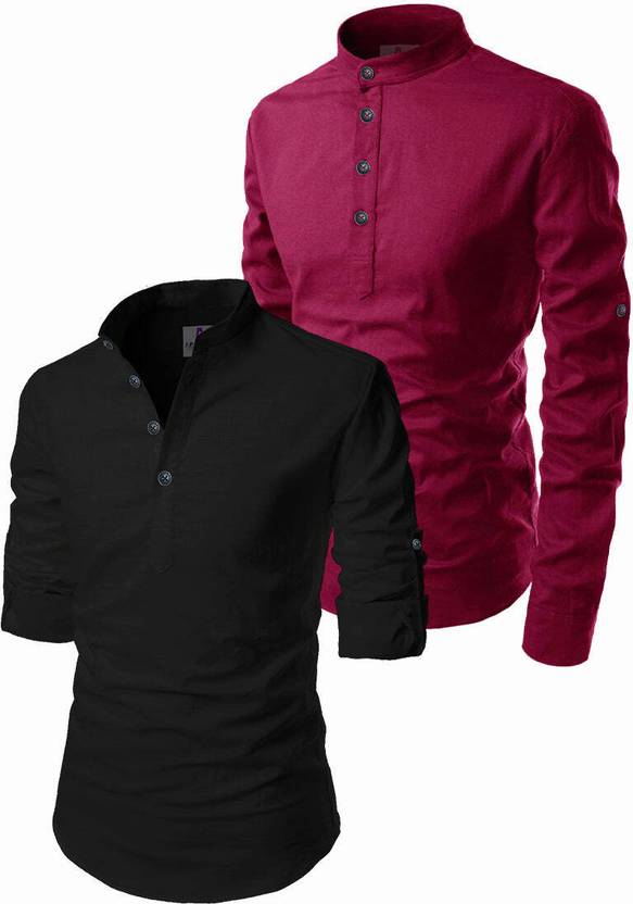 Introducing the Apketra Men's Cotton Blend Kurta Pack of 2 in a sophisticated solid pattern. The Comon Black base, coupled with accent colors like Grey, Maroon, Orange, and more, ensures a wardrobe essential for every occasion.