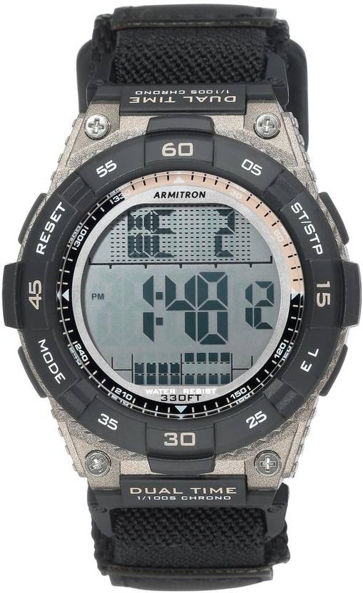 ARMITRON PRO 53 CHRONOGRAPH 40/8330BLK Gents Digital Watch 53mm Brown Resin Case Black Nylon Slip-Thru Strap Features include hour/minute/seconds, 100 year day/date, chronograph with lap time, dual time, alarm, 12/24 hour time, hourly chime and backlight with 3 second fade LCD Display Water Resistant to 330 Feet