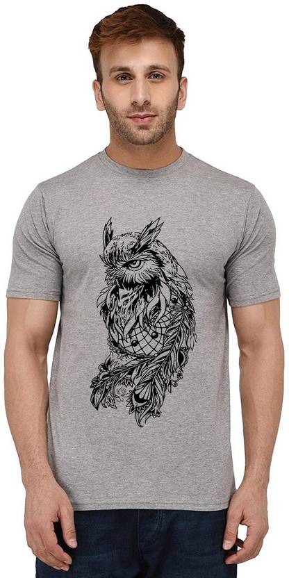 Aseria Owl Dream Catcher Men Graphic Print Round Neck Pure Cotton Grey T-Shirt