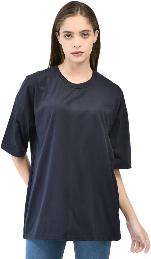 Women Solid Round Neck Cotton Blend Blue T-Shirt