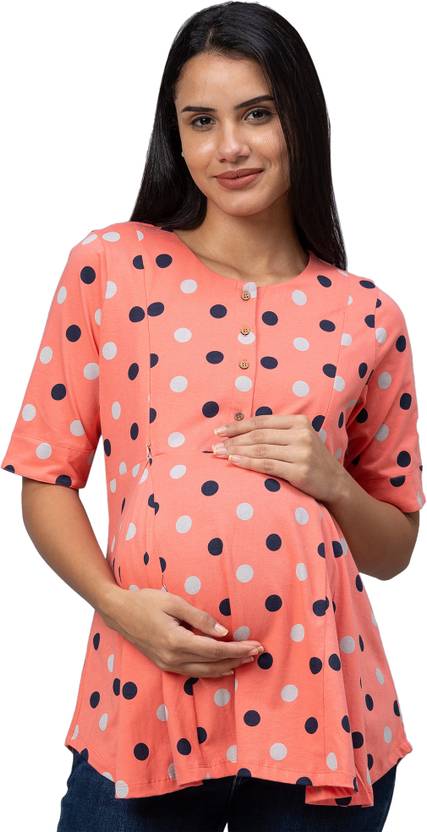 AV2 brings wide range of maternity & nursing tops and tunics for pregnant women. This maternity feeding top features round neck with placket in polka dot print, discreet 2 vertical zippers are provided for easy maternity / nursing use. It is made with soft and flowy cotton fabric, sleeves are cuffed style. Pair it with your favourite pregnancy pants for casual outing or with comfy nightwear bottoms for all day use, made with soft cotton fabric for feeding mothers.