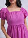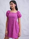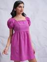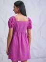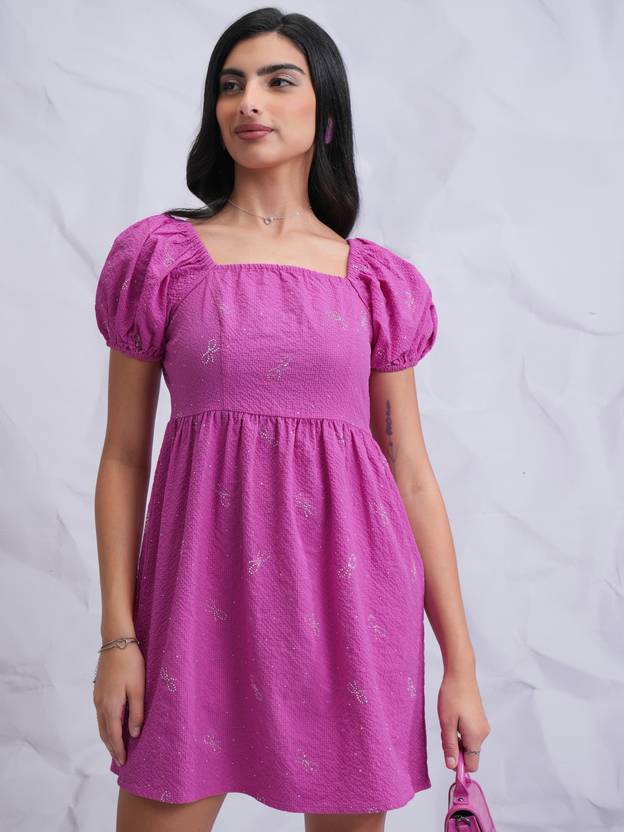FIT AND FLARE TEXTURED FABRIC MINI DRESS. EMBELLISHED FABRIC. PUFF SLEEVE WITH ELASTICATED SHOULDER & HEM. CONCEALED ZIPPER AT SIDE SEAM FOR CLOSURE.