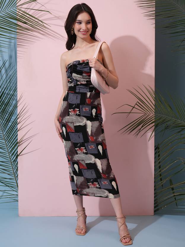 BODYCON PRINTED MIDI DRESS WITH STRAIGHT NECKLINE AND EXPOSED SHOULDERS. SLEEVELESS DRESS WITH RUCHING DETAIL AT FRONT. FULLY LINED DRESS WITH STRAIGHT HEMLINE.